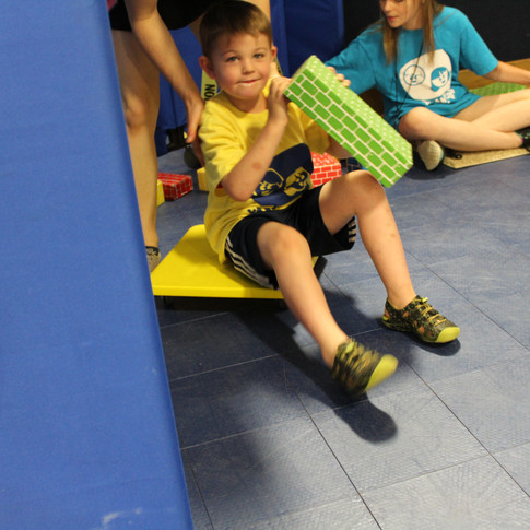 Today play class we started with a fun team game. One person throws a large dice and it lands on different sides. Every side how some kind of neat action. We then hopped, crab walked, skipped, or run to the next line. Everyone had a turn to throw the dice and we all got to move our bodies in different ways. After, we played our favorite game! We built a tower as a team. Sitting on the scooter, we moved across the gym!