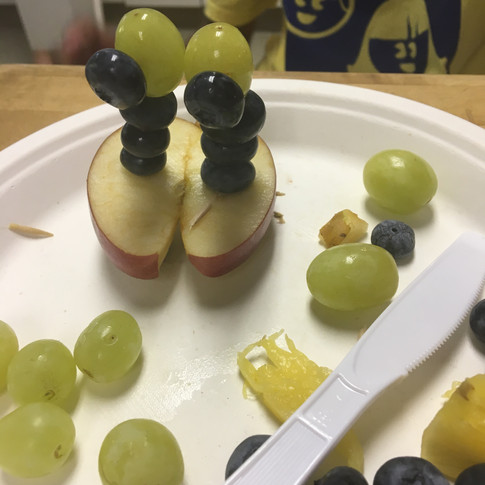 Today in cooking we got to make our very own creations! We used different fruits and toothpicks to be able to build something neat. We were going to build a car, and there were directions we could follow. Mostly it was fun to be unique and make aliens, battle ships, and whatever else we could think about.